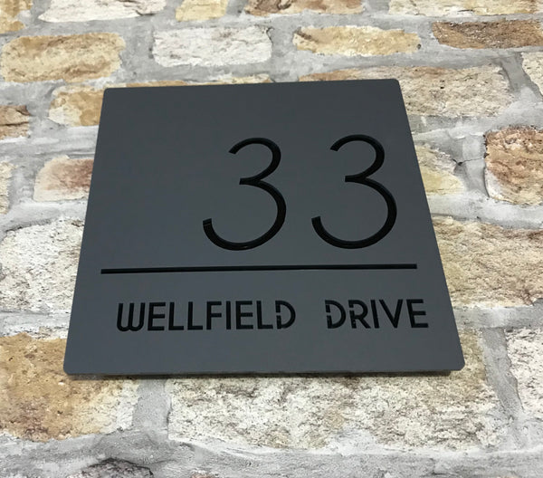 A contemporary house sign that will put the finishing touch to the front of your home. This house sign is made from a 3mm matt grey acrylic with an contrasting coloured backing.