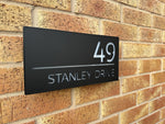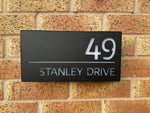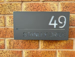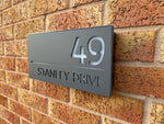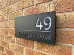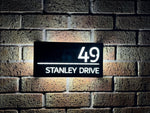 This house sign comes in a matt grey or matt black finish, with a personalised laser cut front panel. We can personalise the front panel with the required address, which then allows the light to pass through when illuminated. With the combination of backlighting and rear wall light projection this sign is very visible at night, making finding your home easy for visiting guests, Delivery’s or emergency services.
