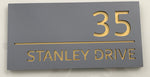 This house sign is made from a 3mm matt grey or matt black acrylic with an contrasting 3mm coloured acrylic backing. There are several choices of backing colours which are mirrored silver, gold, gloss white, gloss black, gloss green. Gloss red and gloss blue.