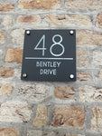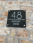 The house sign has a floating effect as it is attached via four stainless steel mounts. All materials are UV stable and weather resistant making this contemporary house sign one of the toughest on the market. Size 180x180mm. All of our house signs come with fixings and fitting instructions provided.