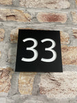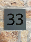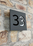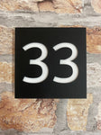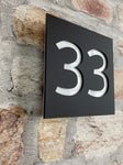 This house number is made from a matt grey or matt black front with a gloss white backing. This house number is mounted via hidden stand-off mounts giving the sign a floating affect.