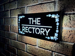 This contemporary house sign with built-in LED backing lights and rear wall light projection, is designed to replace your old porch light.