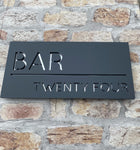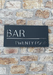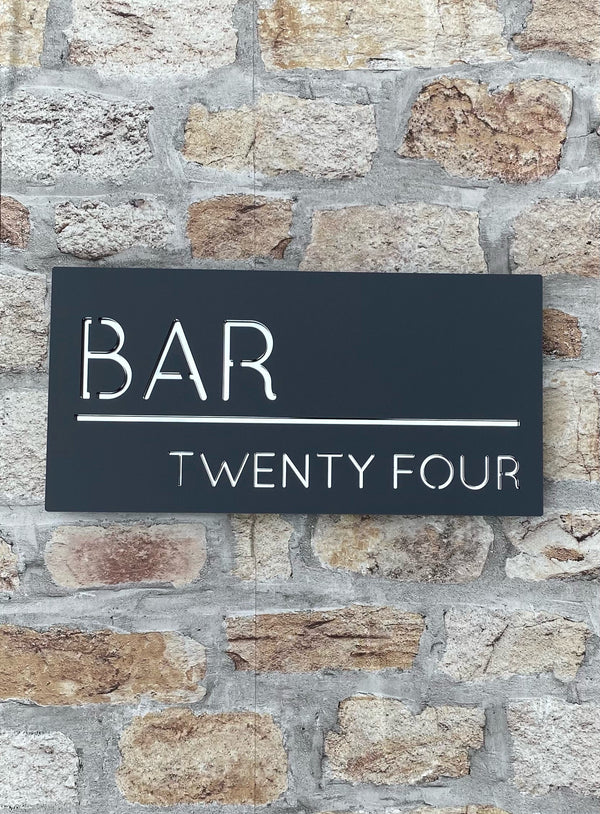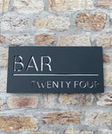 This bar sign is made from a 3mm matt grey acrylic with an contrasting coloured backing. There are several choices of backing colours which are mirrored silver, gold or gloss white, gloss black, gloss blue, gloss red, gloss green.
