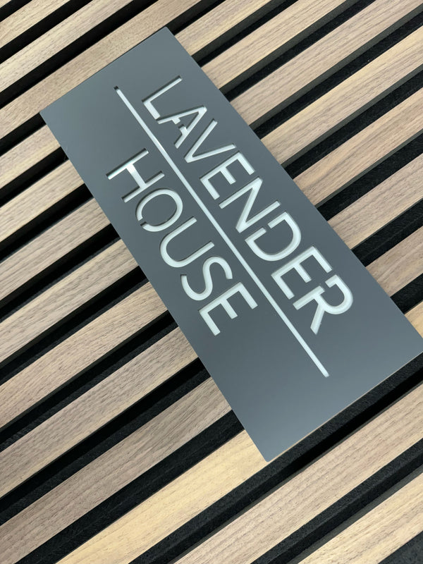 A contemporary house sign that will put the finishing touch to the front of your home. This house sign is made from a 3mm matt grey acrylic with an contrasting coloured backing.