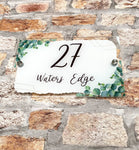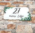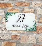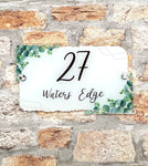 This sign is made from a 3mm clear acrylic front plate with the address & Eucalyptus design that is reverse printed using the latest UV printing technology.