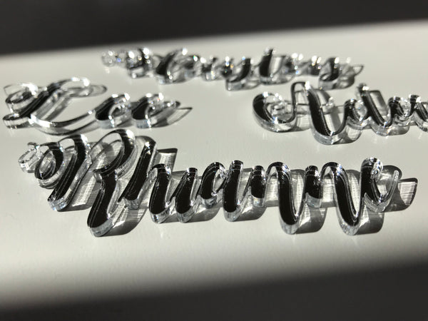 Laser Cut from 3mm mirrored acrylic, can be used as place names, really eye catching placed around a table, perfect for weddings, christenings, formal meals etc.
