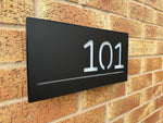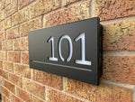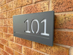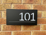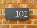 This house sign comes in a matt grey or matt black finish, with a personalised laser cut front panel. We can personalise the front panel with the required address, which then allows the light to pass through when illuminated. With the combination of backlighting and rear wall light projection this sign is very visible at night, making finding your home easy for visiting guests, Delivery’s or emergency services.