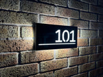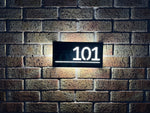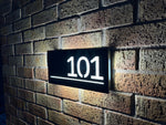 This contemporary house sign with built-in LED backing lights and rear wall light projection, is designed to replace your old porch light.