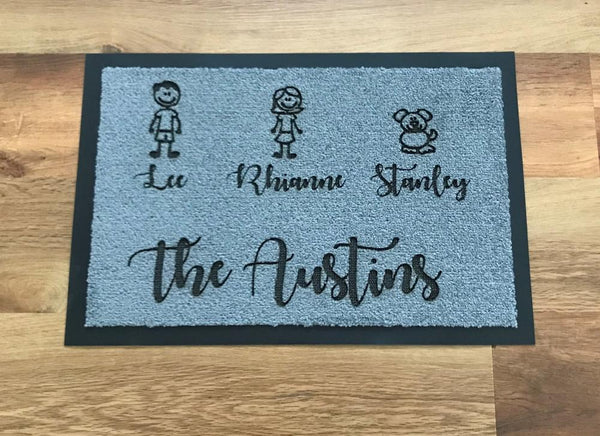 Personalised your doormat with your family name and your own individual Stick person character for each member of the family.